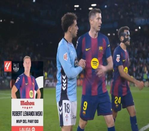 官方消息,莱万多夫斯基当选塞尔塔对阵巴塞罗那一役全场最佳。