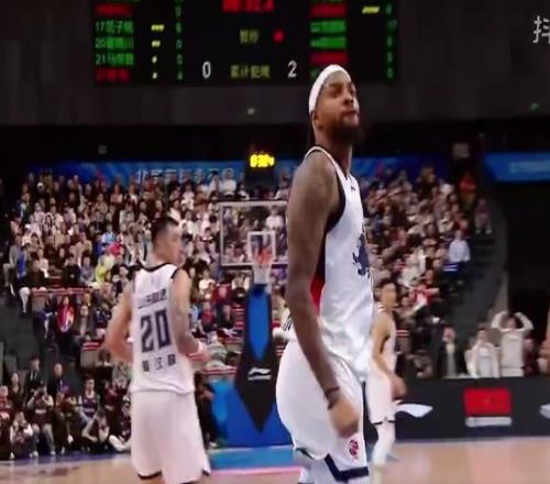 第四节赛场突发火药味!比赛还剩下8分钟34秒,山东外援珀赛尔杀入北京队禁区,一跃而起双脚腾空隔扣了周琦,